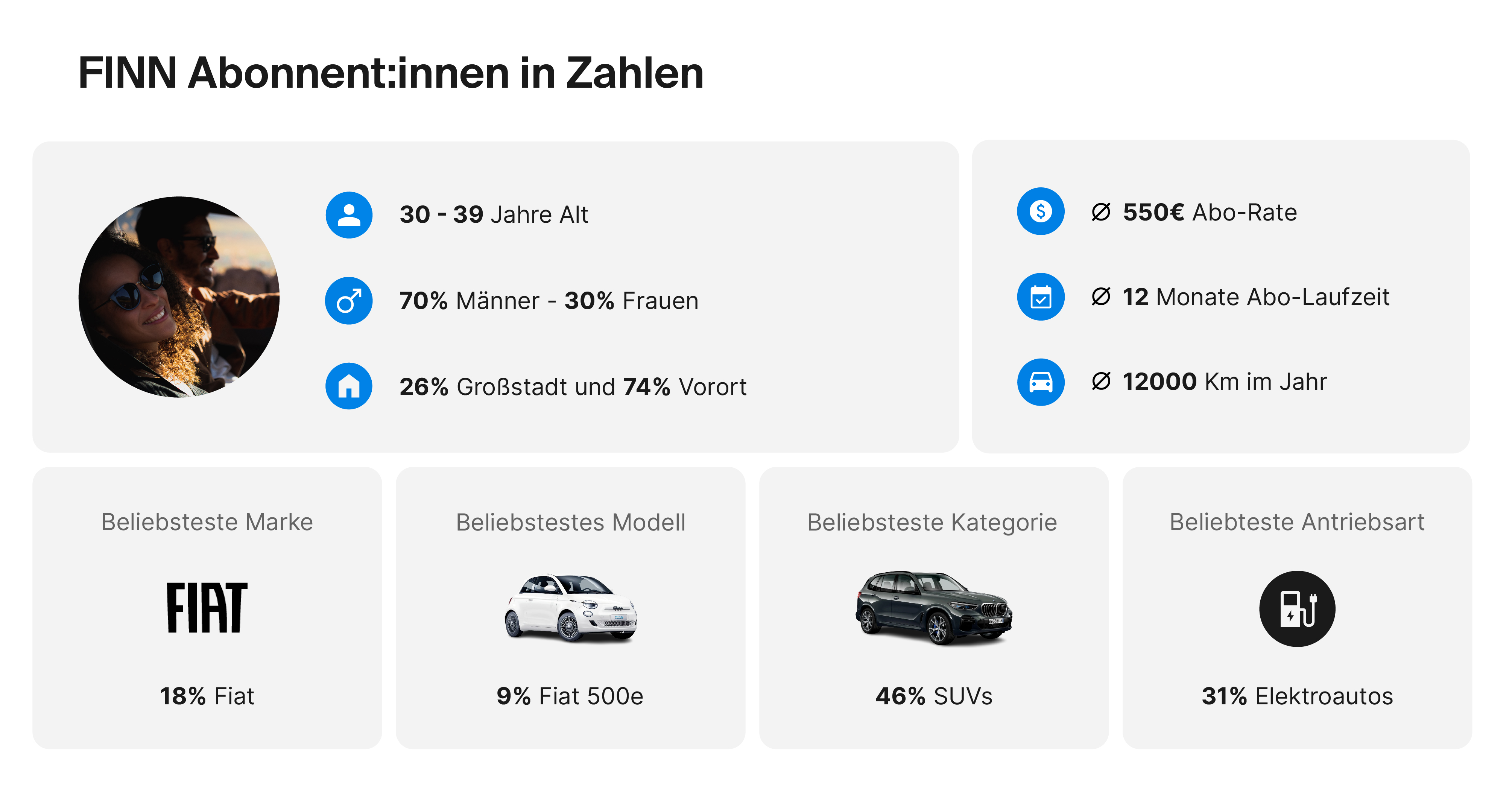 Mit dem neuen Daten-Report gibt FINN erstmals umfassende Einblicke in die Auto-Abo-Branche. Die vorliegenden Daten konzentrieren sich ausschließlich auf das Privatkundengeschäft und erlauben es somit, die Eigenschaften und Verhalten durchschnittlicher Auto-Abonnent:innen detaillierter zu untersuchen.